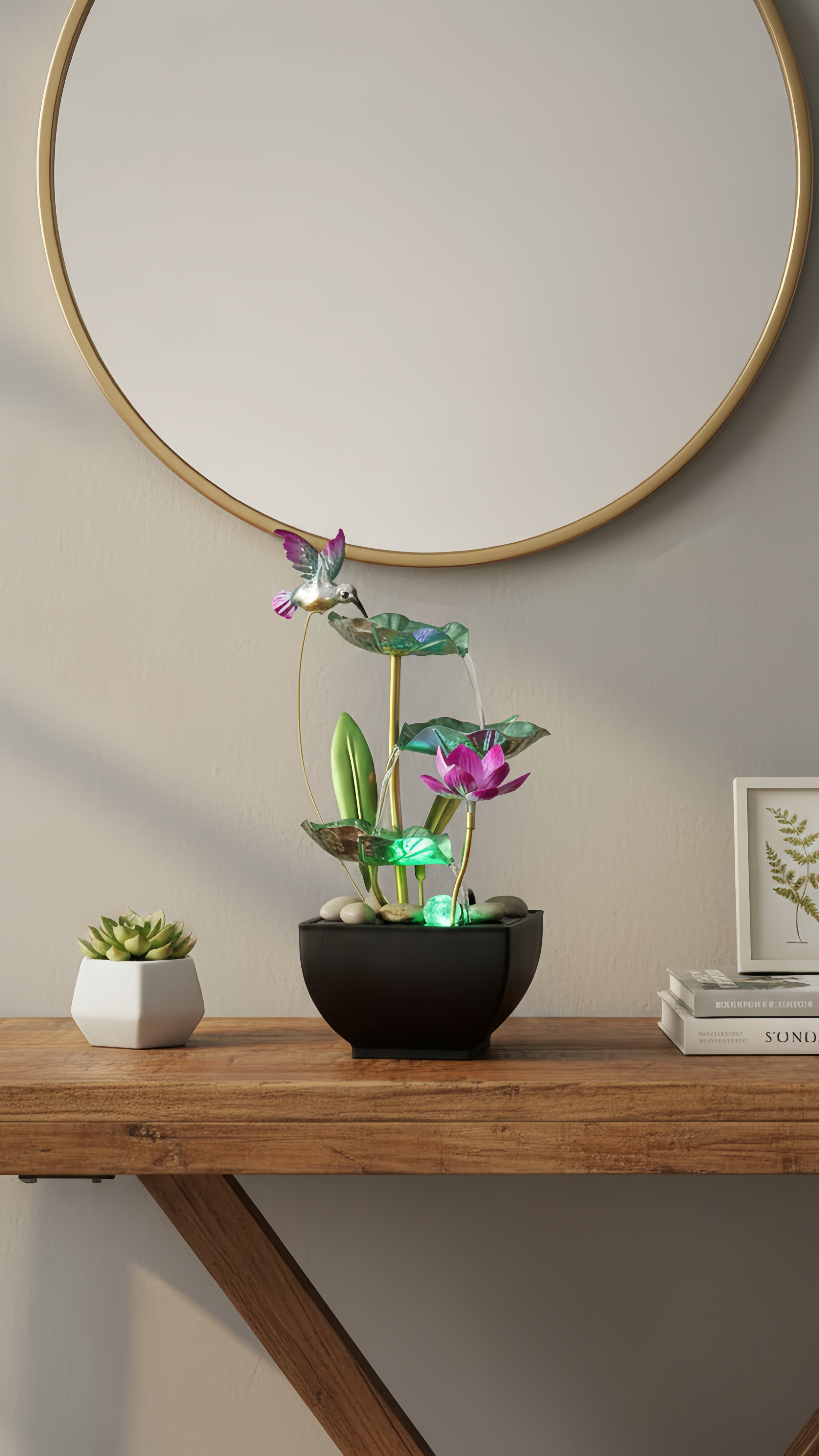Transformez votre intérieur en un sanctuaire de paix. Le murmure de l'eau et le colibri vibrant offrent une évasion. Un refuge où l'harmonie s'épanouit pour un bien-être.