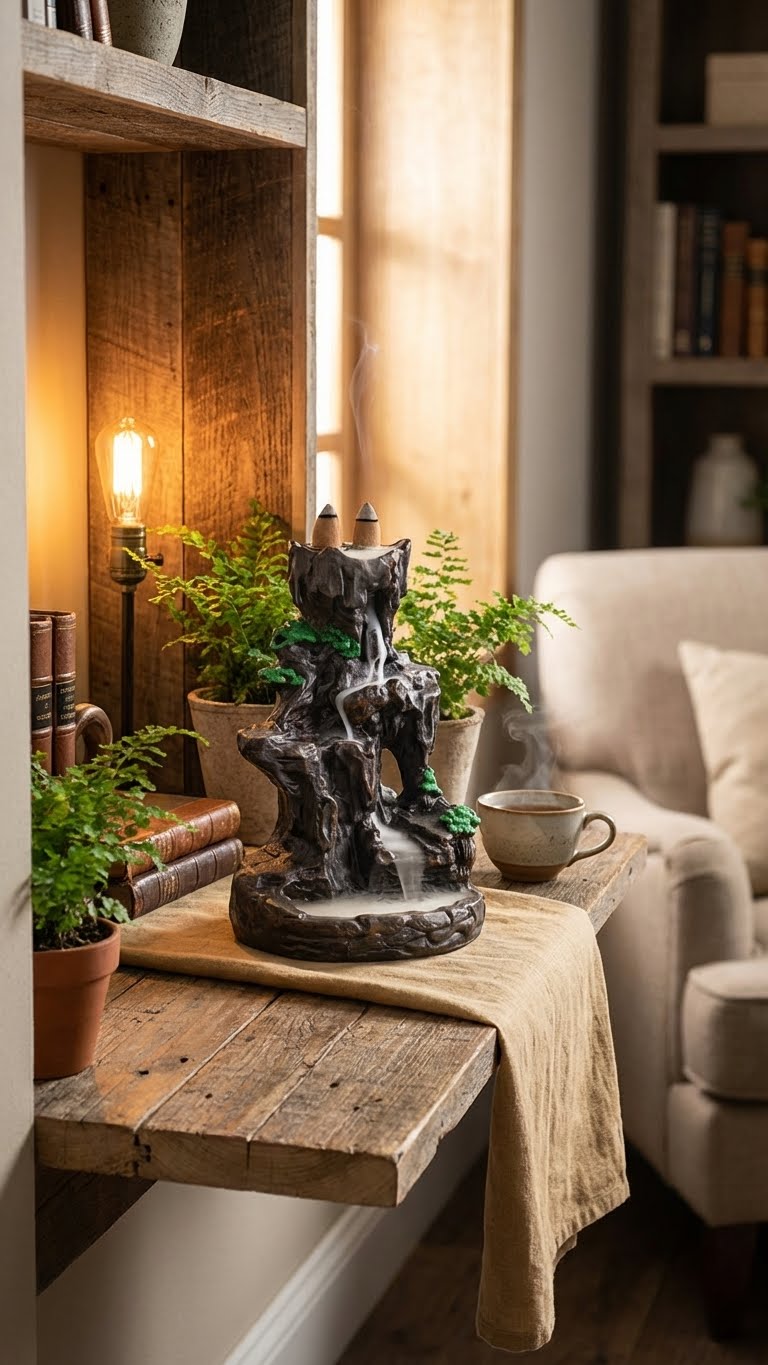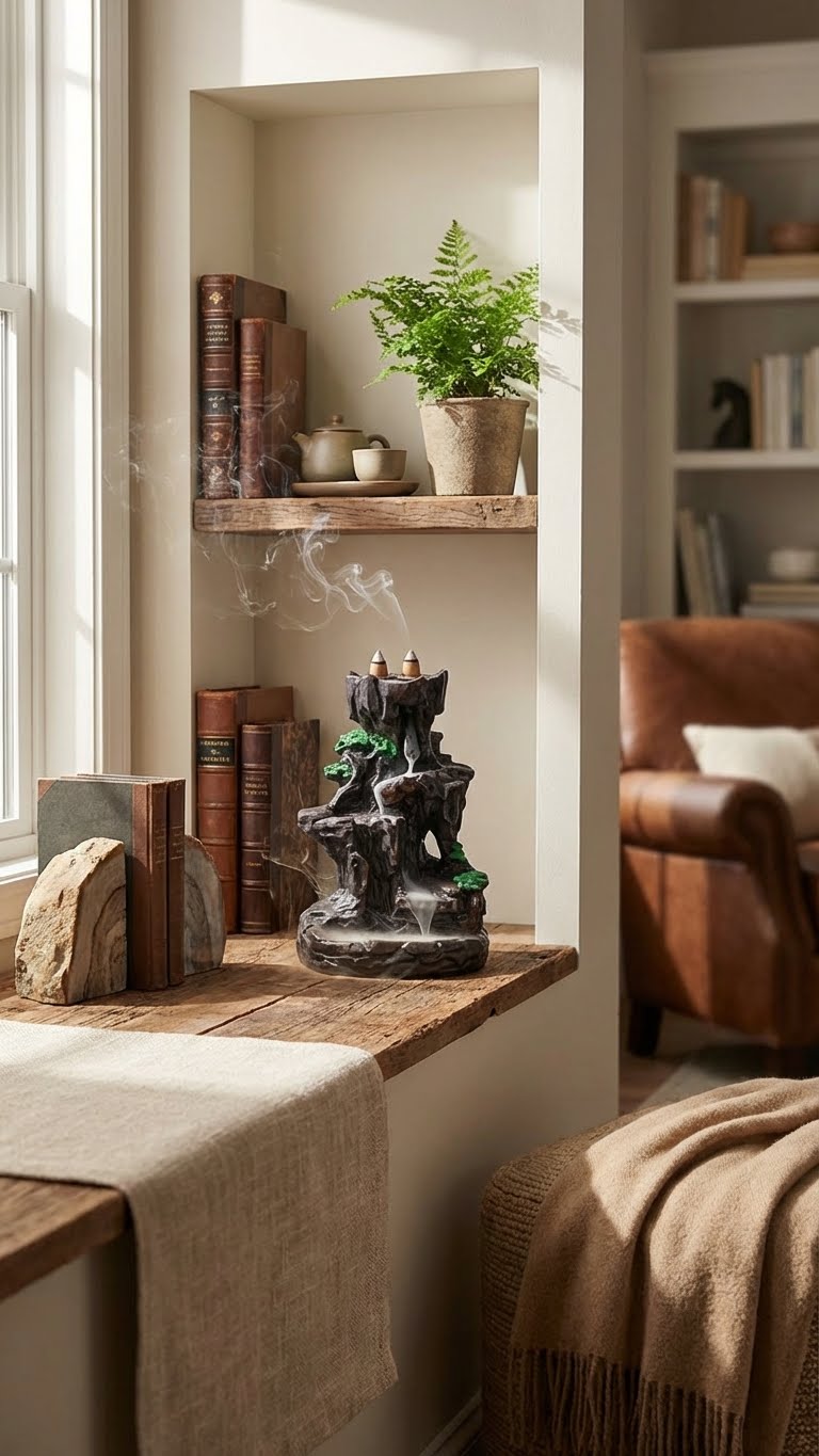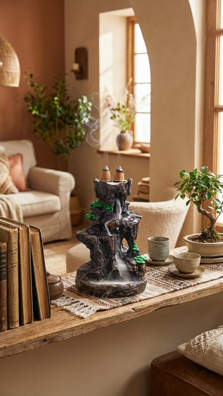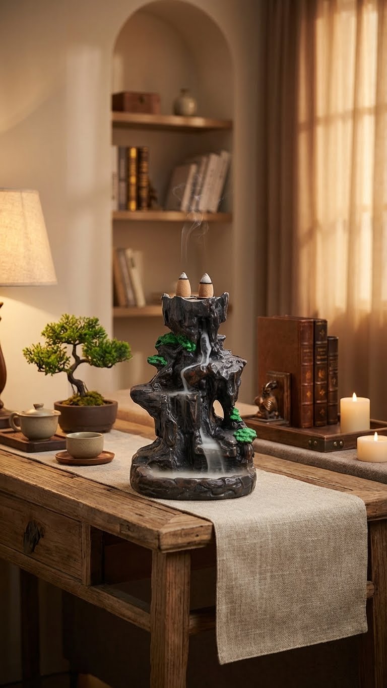 L'art de la cascade de fumée est simple. Placez délicatement un cône d'encens à refoulement sur l'ouverture supérieure et observez la brume éthérée descendre, créant une danse visuelle apaisante et un sanctuaire olfactif unique.